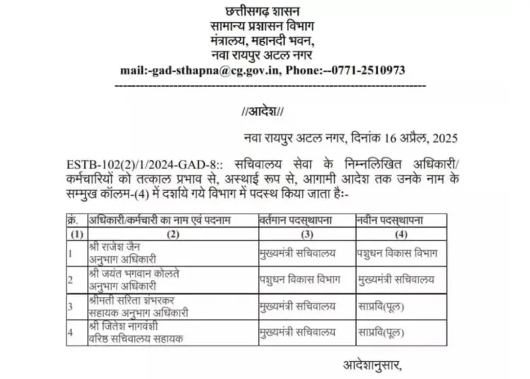 इन अफसरों को दी गई नई जिम्मेदारी: इस आदेश के तहत राजेश जैन को पशुपालन विकास विभाग में नई जिम्मेदारी दी गई है. वहीं, जयंत भगवान कोलते को मुख्यमंत्री सचिवालय में नियुक्त किया गया है. सरिता संभरकर और जितेश नागवंशी को सामान्य प्रशासन विभाग (पूल) में स्थानांतरित किया गया है, जहां उन्हें जल्द ही नई जिम्मेदारी सौंपी जाएगी. सामान्य प्रशासन विभाग की ओर से जारी आदेश के मुताबिक प्रशासन को और अधिक चुस्त-दुरुस्त बनाने के उद्देश्य से यह फेरबदल किया गया है. सरकार अनुभवी और कुशल अधिकारियों को उनके अनुभव के अनुसार जिम्मेदारियां देकर प्रशासन को और अधिक प्रभावी बनाने का प्रयास कर रही है।