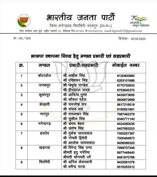 छग भाजपा ने स्थापना दिवस पर मंडल प्रभारियों करी घोषणा