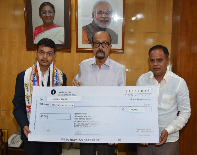रायपुर : राज्यपाल रमेन डेका ने आज यहां राजभवन में बेमेतरा जिले के मेधावी छात्र आदित्य तिवारी का सम्मान किया। राज्यपाल डेका ने छात्र को 10 हजार रूपए की प्रोत्साहन राशि प्रदान की, साथ ही राजकीय गमछा एवं स्मृति चिन्ह भेंट किया। डेका ने छात्र के उज्ज्वल भविष्य के लिए शुभकामनाएं दी।