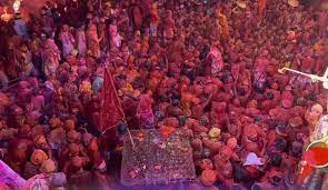 दरसन दै निकरि अटा में ते, दरसन दै... गाते हुए हुरियारों ने ध्वजा को किशोरी जी के पास रख दिया। मंदिर परिसर में दोनों गांवों के गोस्वामियों ने समाज गायन में एक-दूसरे पर प्रेम भरे कटाक्ष किए। इसके बाद हुरिया रंगीली गली में पहुंचे तो, हुरियारिनें रंगेश्वर महादेव मंदिर और घरों के दरवाजे पर घूंघट की ओट में टोल बना कर खड़ी मिलीं। उन्हें देख हुरियारों ने पंचम वेद के पदों का गायन किया तो हुरियारिनों ने भी रसियों से जवाब दिया। सवा पांच बजे एक हुरियारिन ने हुरियारों को खदेड़ने के लिए लाठी मारी, जिसे बड़ी कुशलता से ढाल पर रोक लिया। श्री लाडली जी मंदिर से लेकर रंगीली गली तक राधा-कृष्ण के जयकारे गूंजते रहे। भक्ति और प्रेम के रंग में रंगने के लिए श्रद्धालुओं की इतनी भीड़ उमड़ी कि मंदिर में पैर रखने तक की जगह नहीं थी।